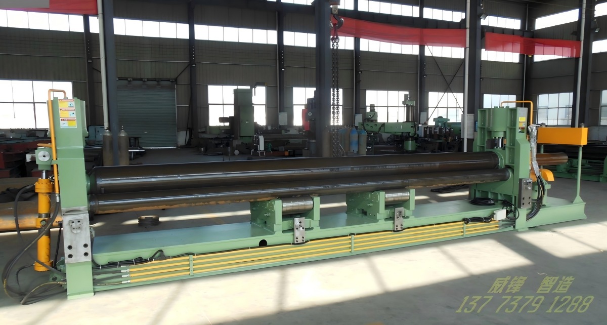 性能与特点: 本机结构型式为三辊对称式,上辊在两下辊中央对称位置作垂直升降运动,通过液压缸内的液压油作用于活塞而获得, 两下辊作旋转运动,通过减速机的输出齿轮与下辊齿啮合,为卷制板村提供扭矩。本机床结构紧凑,操作维修方便。 |