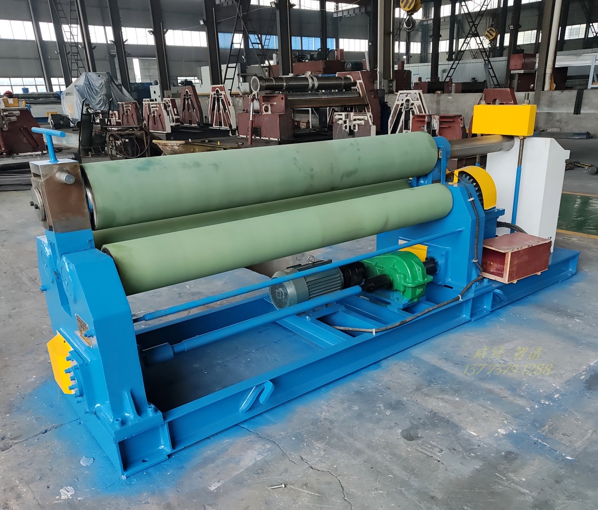 两个辊作旋转运动,通过减速机的输出齿轮与下辊齿轮啮合,为卷制板材提供扭矩。本机床结构紧凑,操作方便。